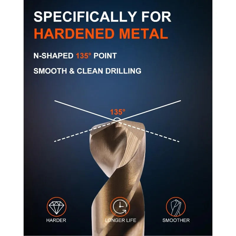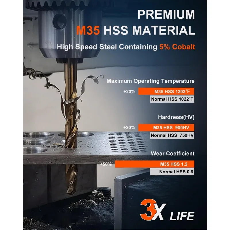 M35 Cobalt HSS Drill Bit Set - Made of high-speed steel with 5% cobalt for superior wear, heat & abrasion resistance. These cobalt drill bits for hardened steel deliver longer lifespan in stainless steel, cast iron & hard alloys versus standard HSS.