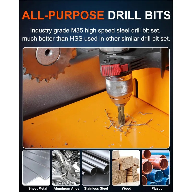 115Pcs Drill Bit Set (1/16"-1/2"), M35 HSS Twist Drill Bits, Jobber Length, Straight Shank, Metal Drills bit Set for Steel, Stainless Steel/Iron/Wood/Plastic, with Metal Indexed Storage Case
