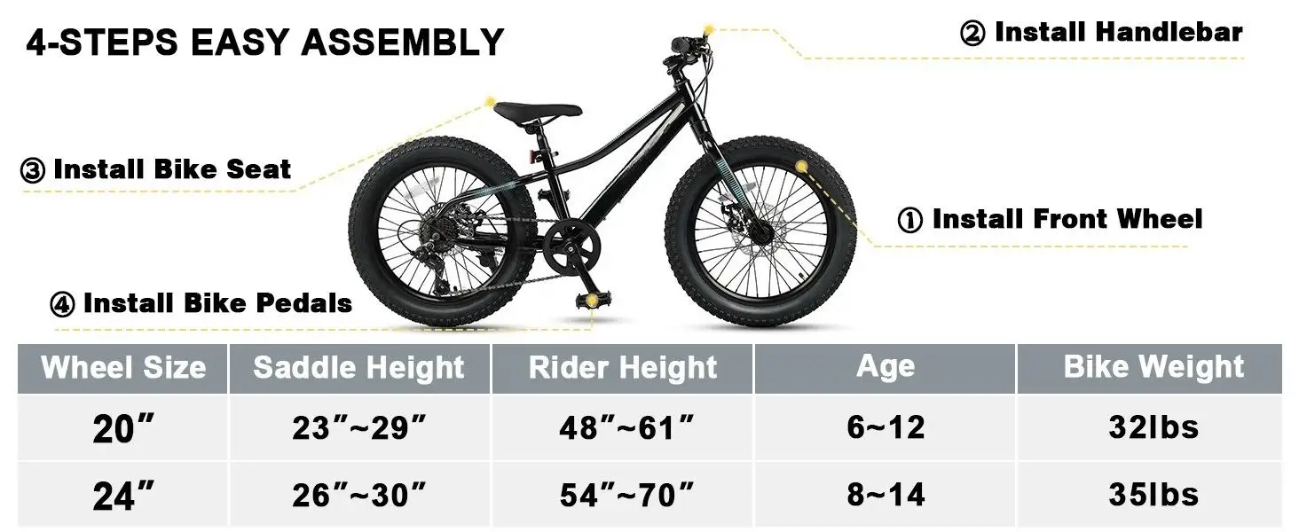- 【Assembly&Size Guide】85% pre-assembled, tools included. If you have any questions about bikes, Please do not hesitate to contact us. The 20-inch bike fits 48-61˝ tall kids for age 6-12.